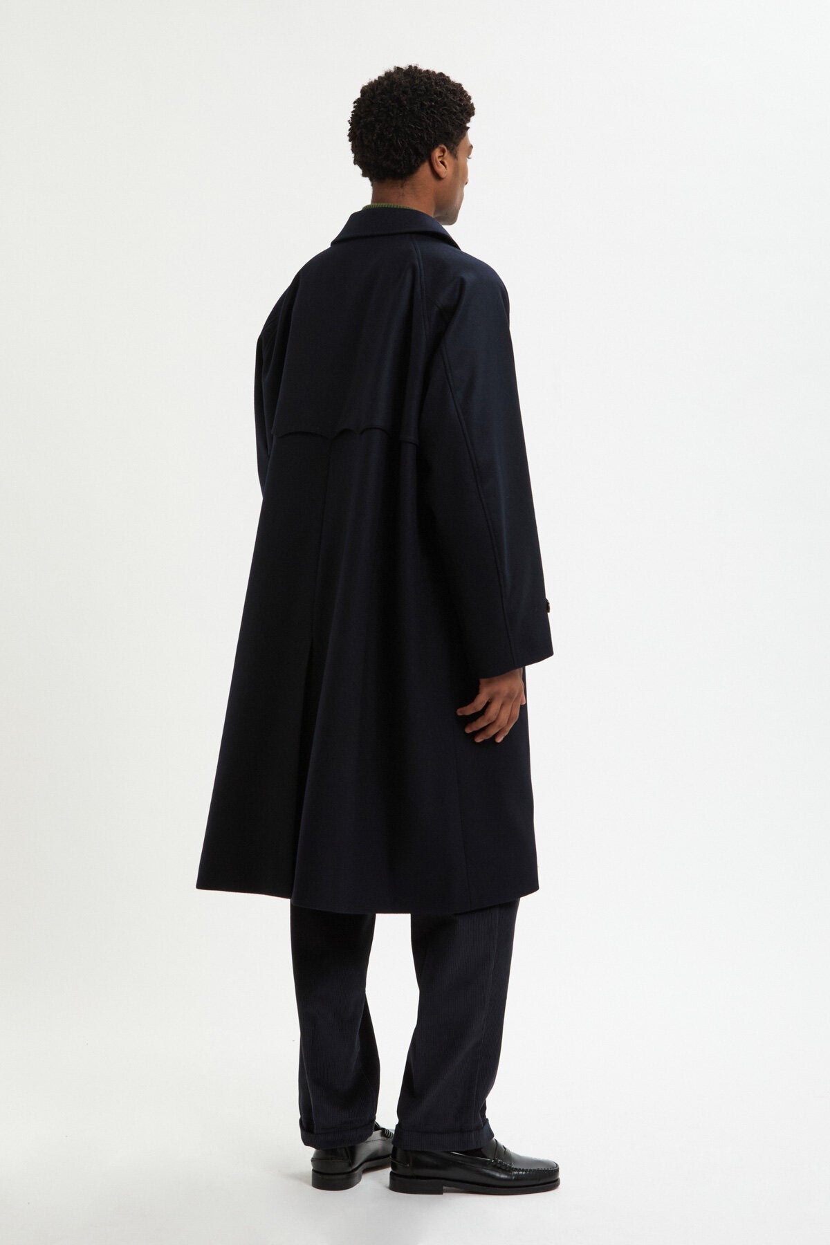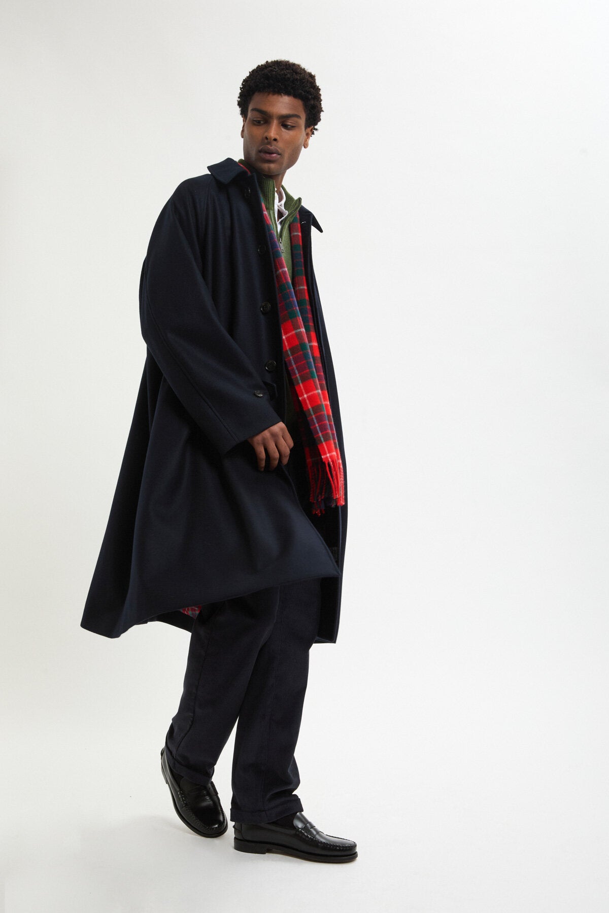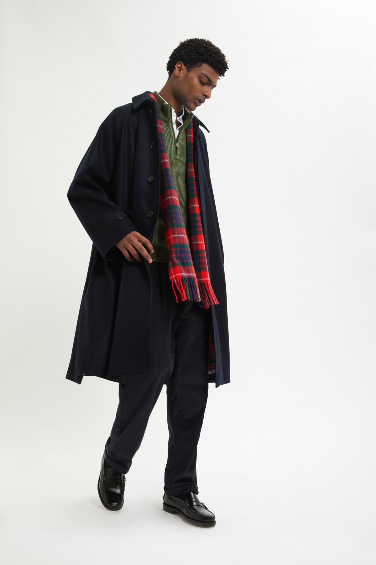 Long, fluide et confectionné en 100 % laine, il suit donc chacun de vos mouvements avec décontraction et assurance, tel que vous le souhaitez lors des matins froids et des promenades venteuses qui vous conduisent vers votre destination. Lorsque le temps n'arrive pas à se décider, il se met au travail. Et à l'intérieur, une touche de Fraser Tartan s'invite en clin d'œil affirmé sous cet extérieur calme et posé. Le col est pourvu d'un petit rabat pressionné à l'intérieur, prêt à accueillir la petite touche de rembourrage que vous y glissez pour plus de chaleur.