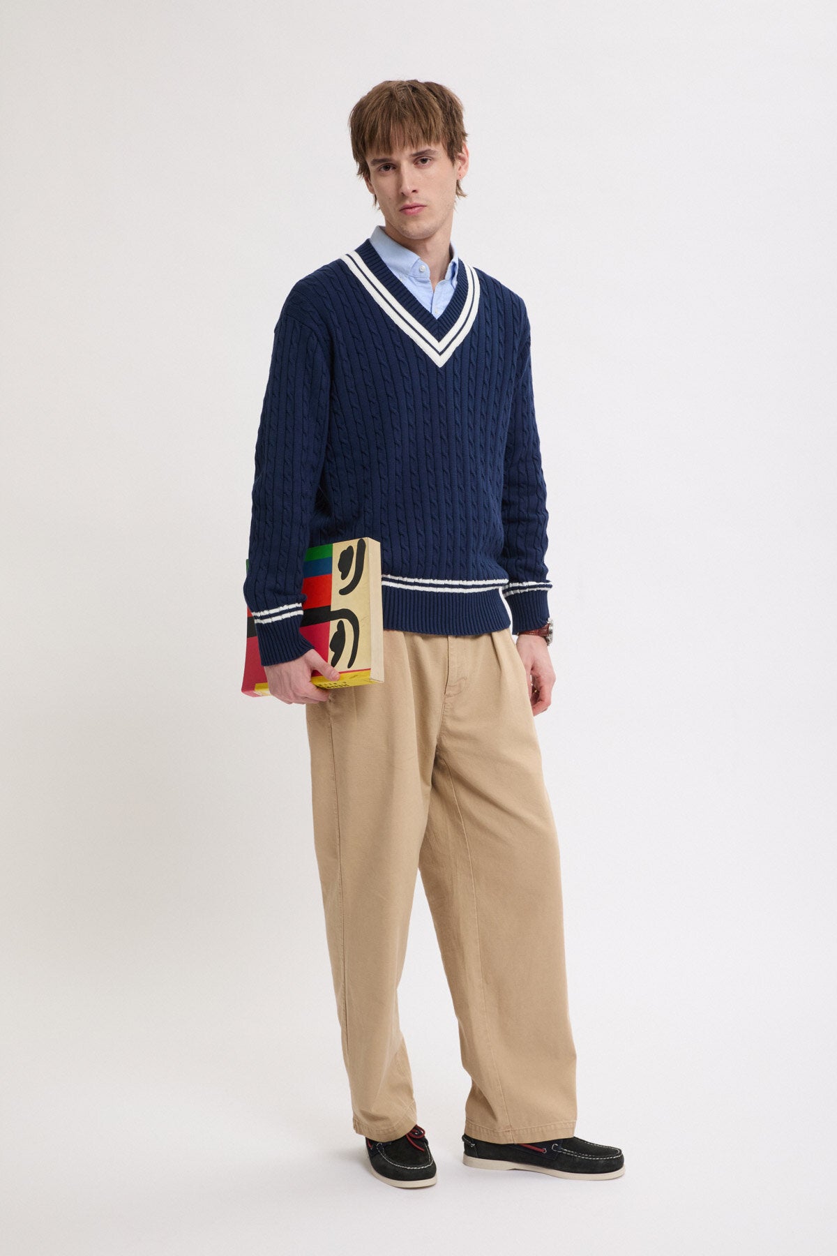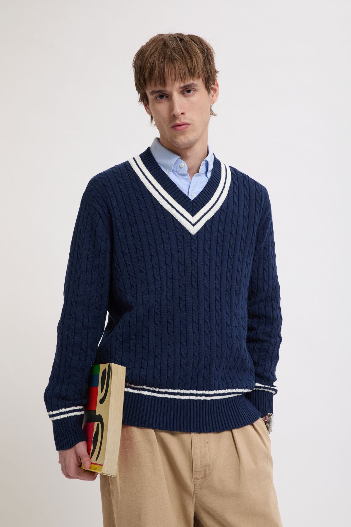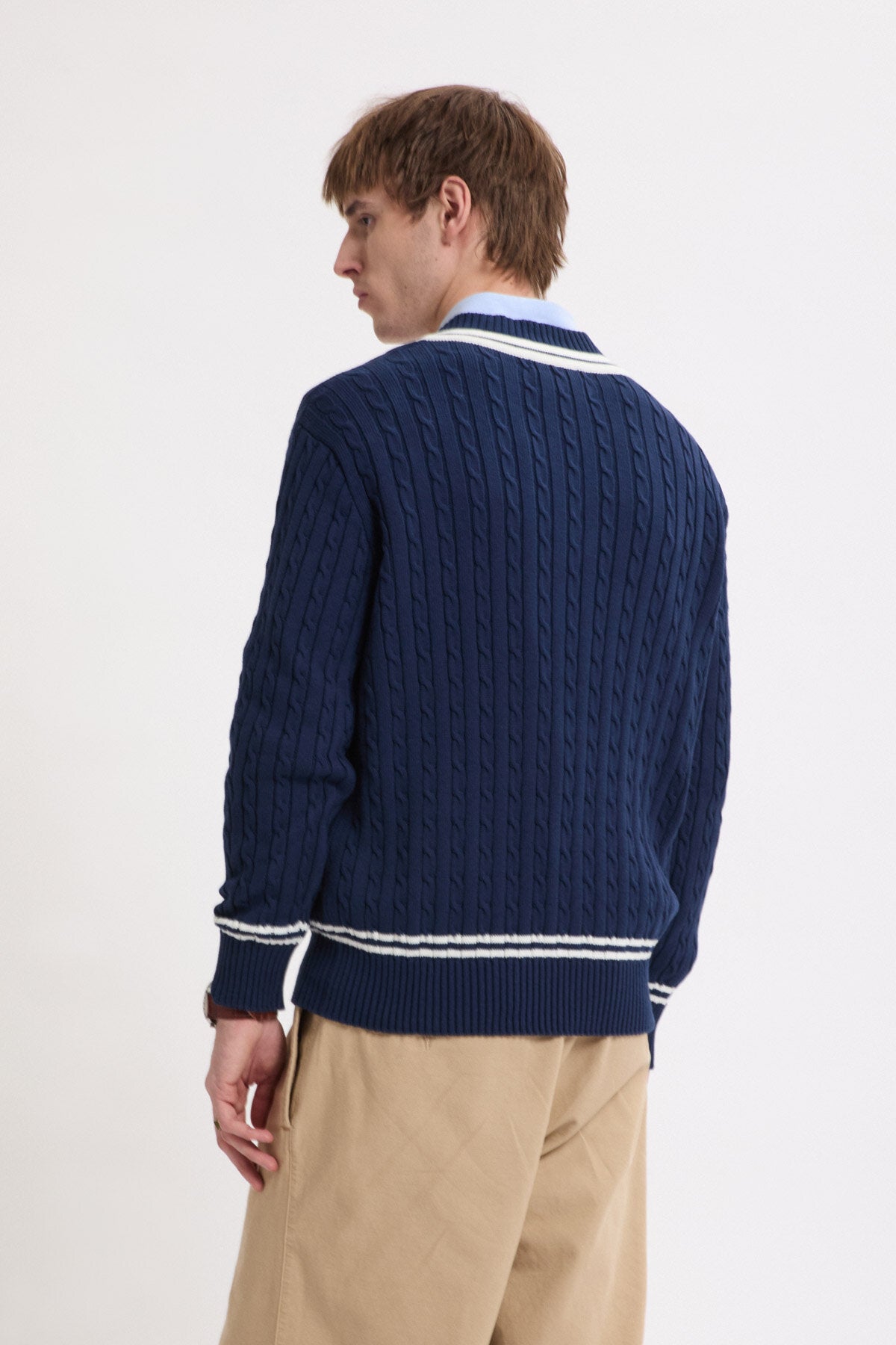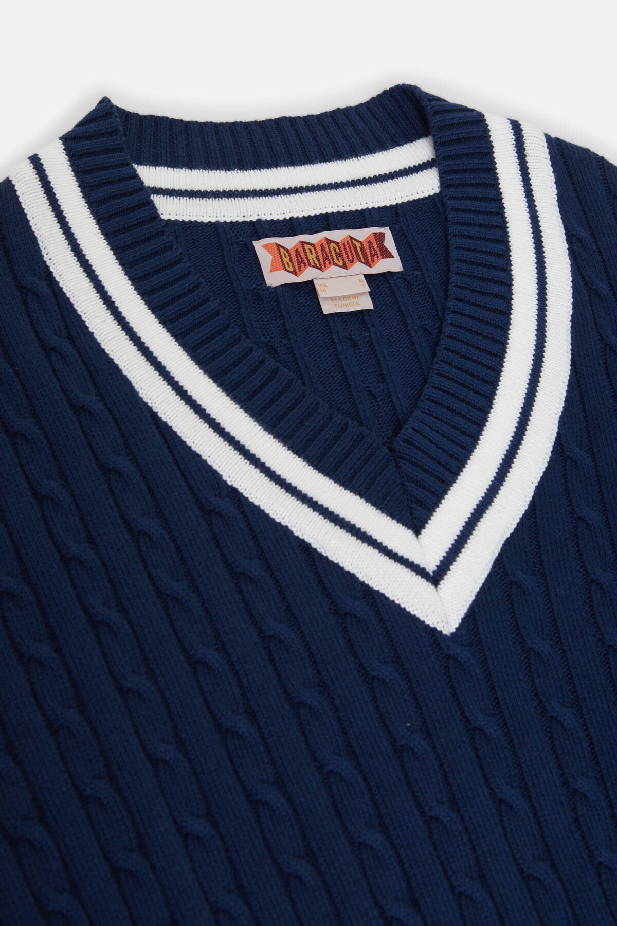 The Cricket V-Neck is made from 100% cotton cable knit, soft yet sturdy for everyday wear.