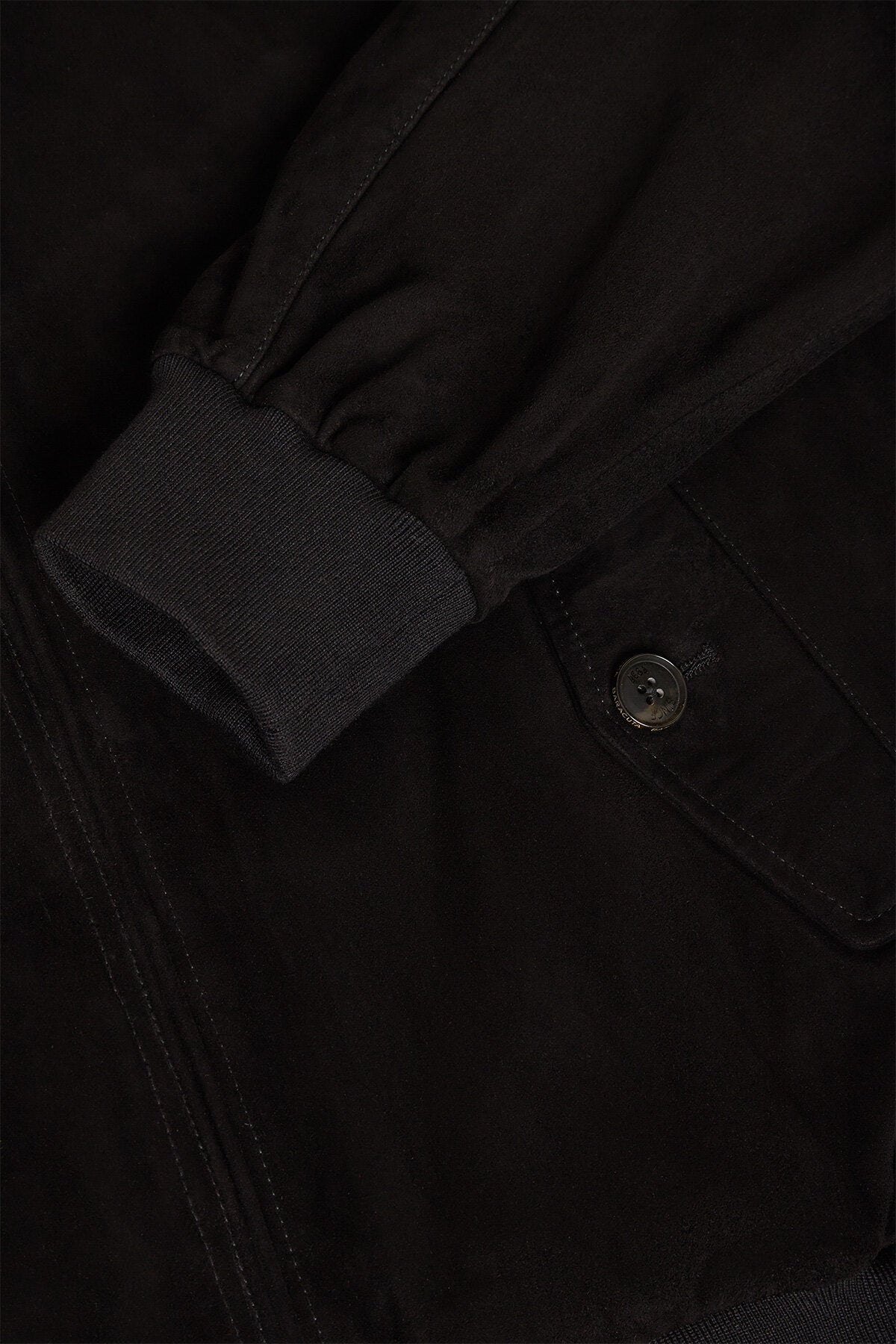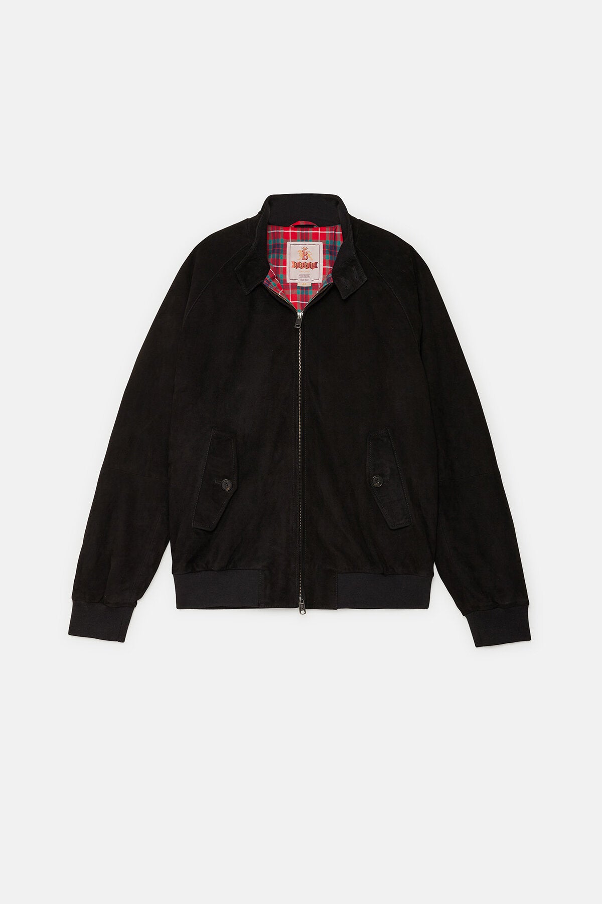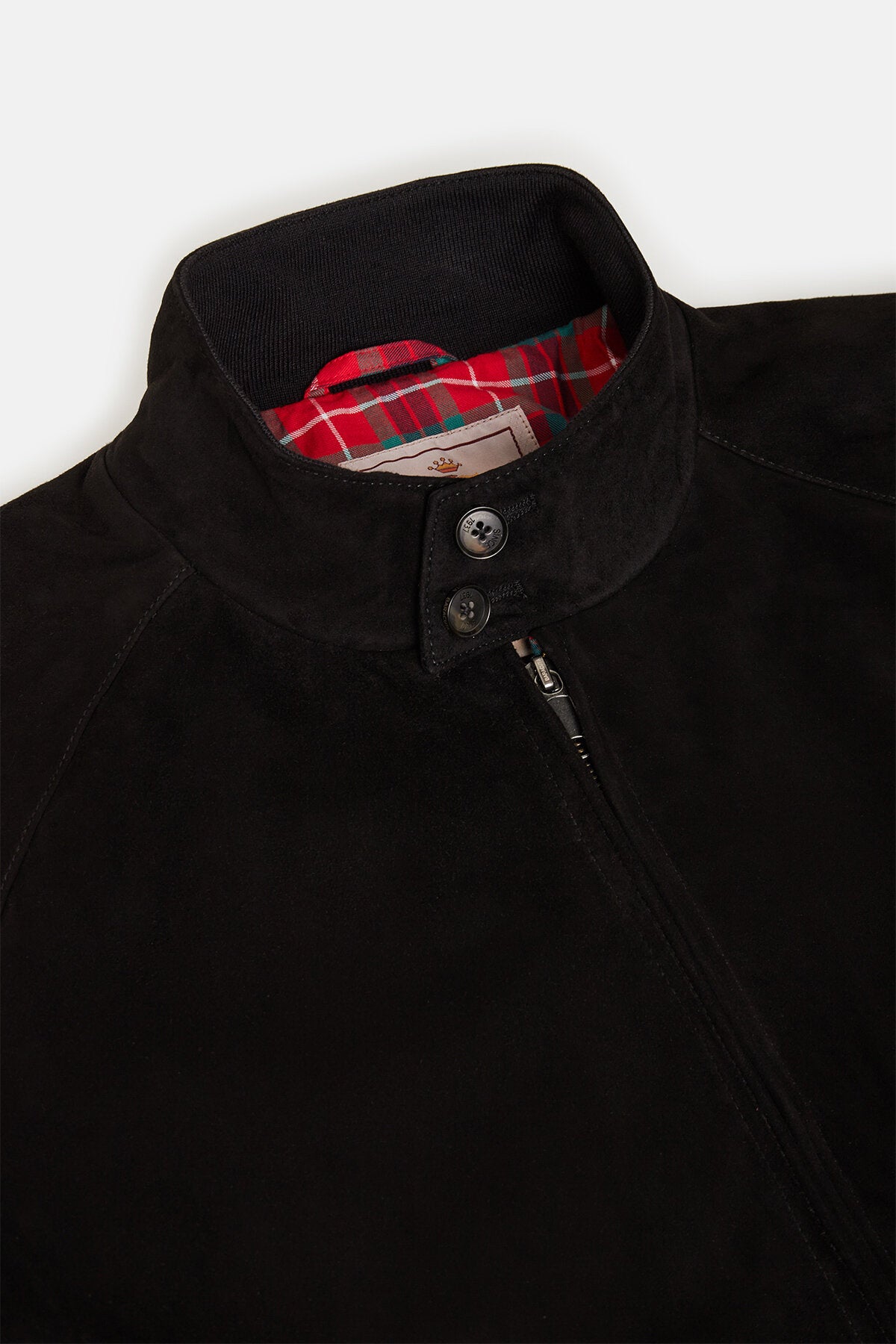 • You can never go wrong with a Suede Jacket. The G9 Suede is the classic Harrington Jacket in fine suede. This garment has made a name for itself and become extremely popular over the years due to its versatility, making it a real style icon. It features our breathable Fraser Tartan lining made from Coolmax® fabric, two-button dog ear collar, slanted side pockets, our signature umbrella back yoke, and ribbed cuffs, waistband and inner collar.