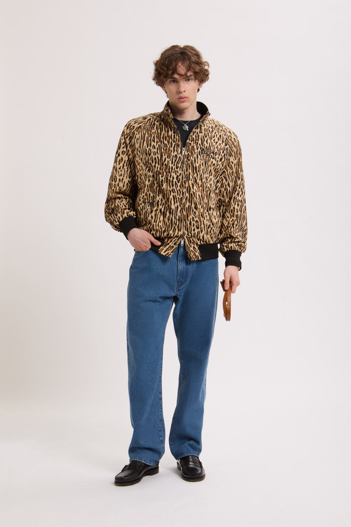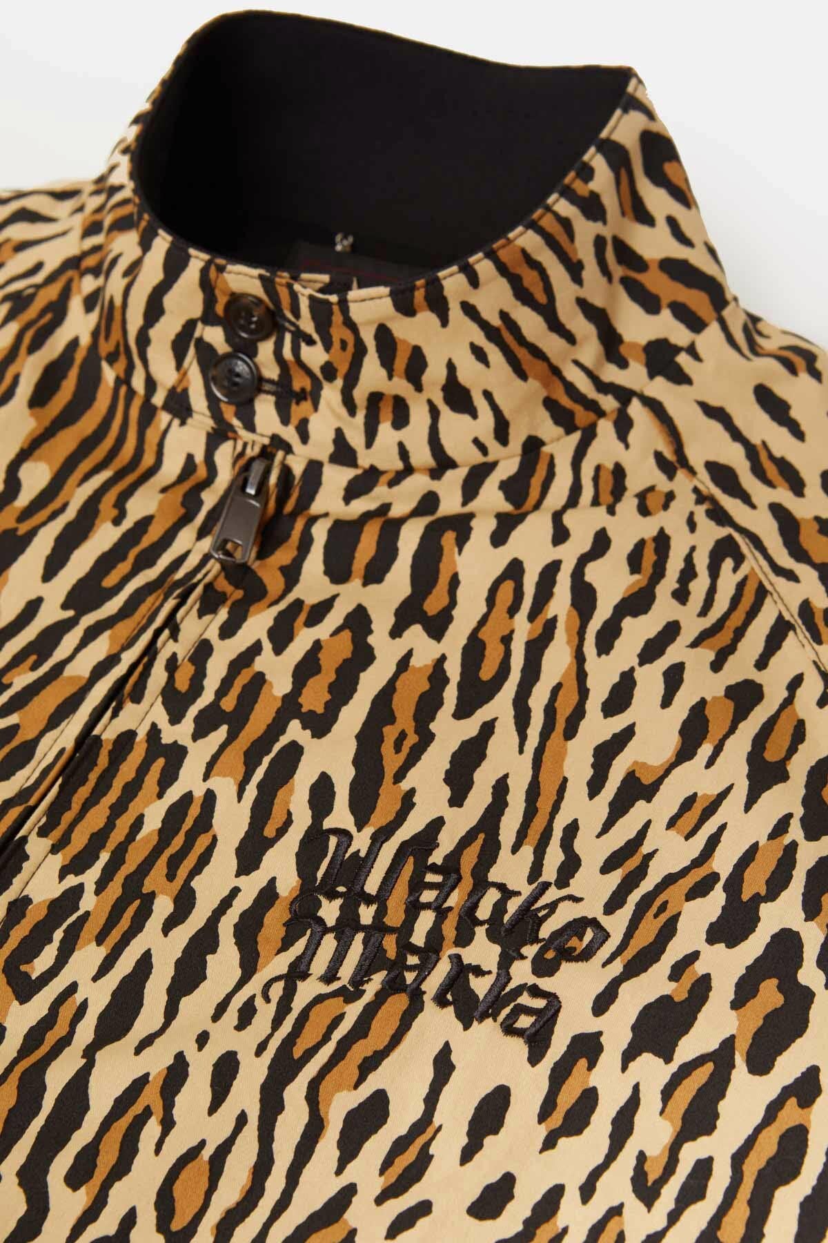 The jacket maintains the signature G9 construction, including the umbrella back yoke, raglan sleeves and ribbed Dog Ear collar with double-button closure. The collaboration is marked by “Wacko Maria” embroidered on the chest, a metal hanging chain and an internal pocket. For this edition, the jacket is finished with a leopard pattern exterior, a print long associated with Wacko Maria.